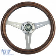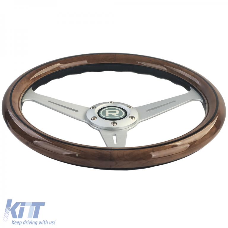 The 35 wooden steering wheel with silver spokes in vintage style combines classic design with modern functionality. With a diameter of 350 mm and a depth of 45 mm, it is optimally suited for classic cars and boats. Thanks to its universal usability, this steering wheel fits perfectly with hubs from well-known brands such as Momo, Sparco, or Supersport.
