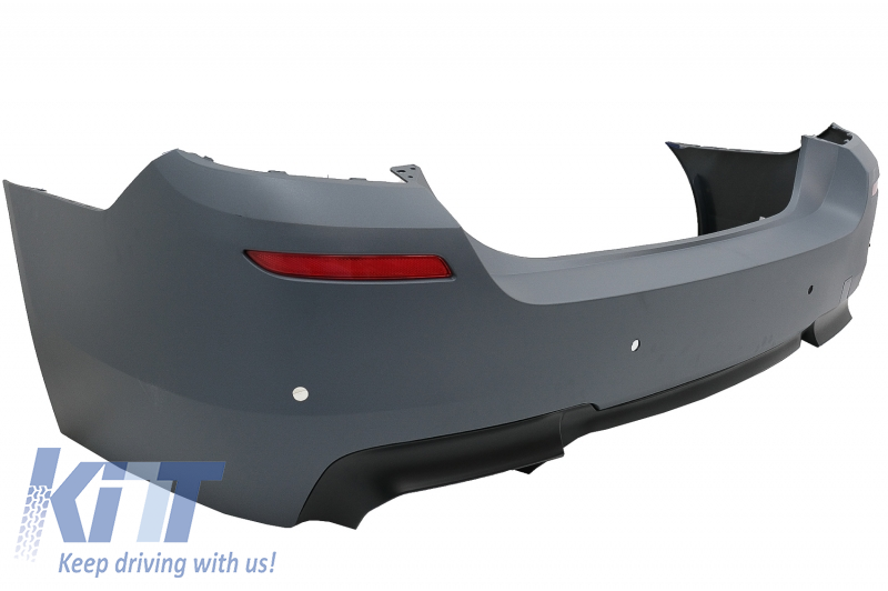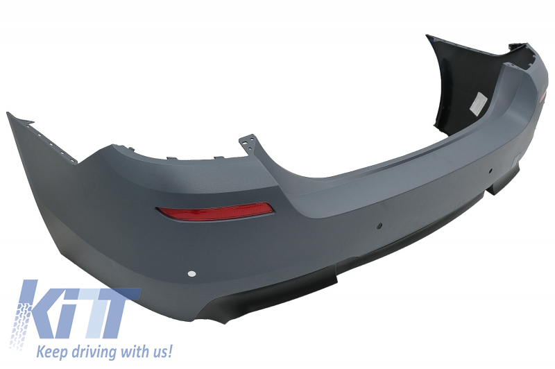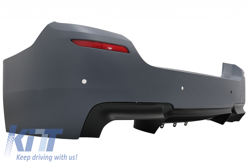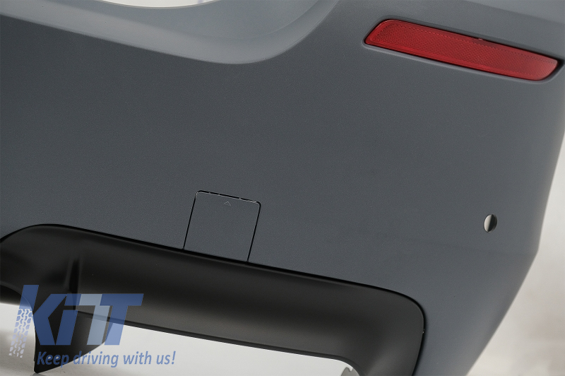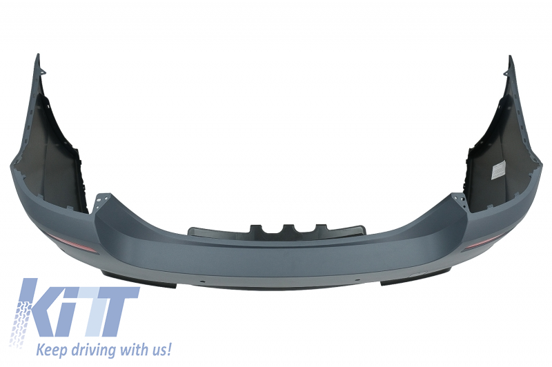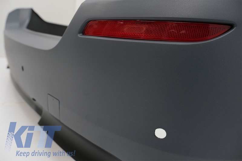 Rear bumper equipped with twin outlet for double exhaust, red reflective accessories and parking sensor holders (PDC).