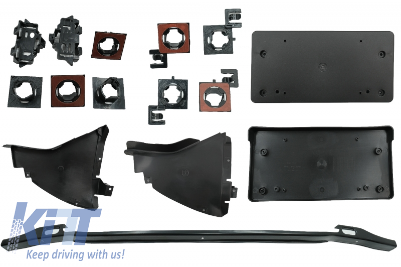 Front Bumper is equipped with central-lower and side grilles, parking sensor holders (PDC) and headlights washer system covers (SRA).