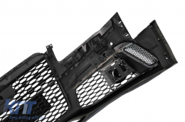 Front Bumper is equipped with a honeycomb central grille, side grilles, lower bumper extension. parking sensor holes/holders (PDC), headlights washer system covers (SRA) and dummy ACC cover