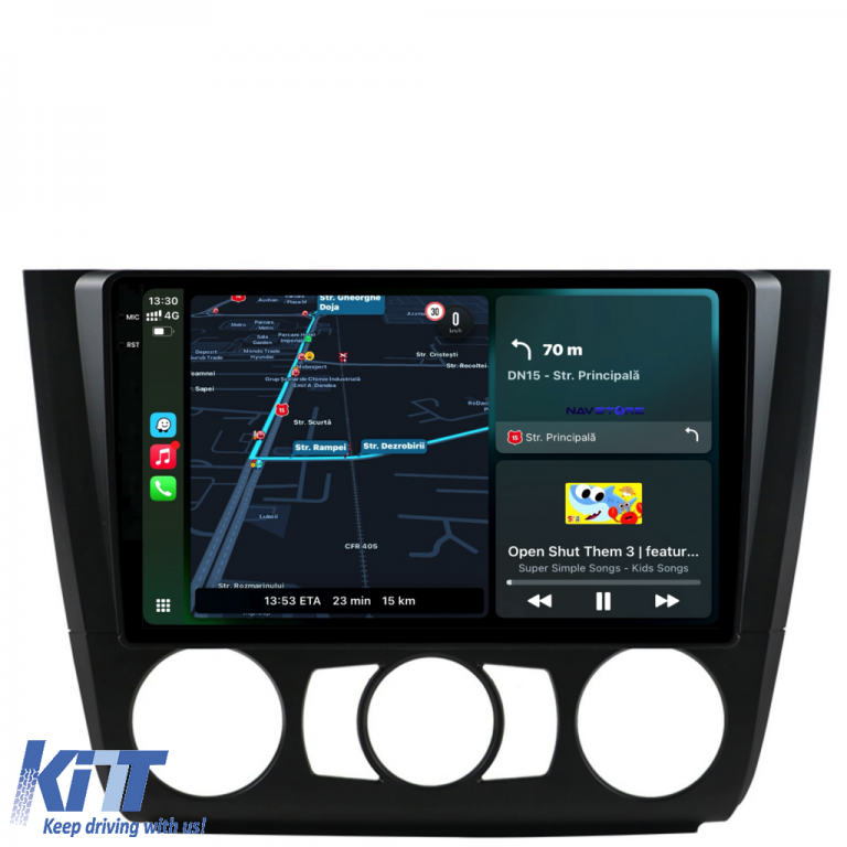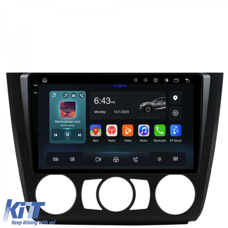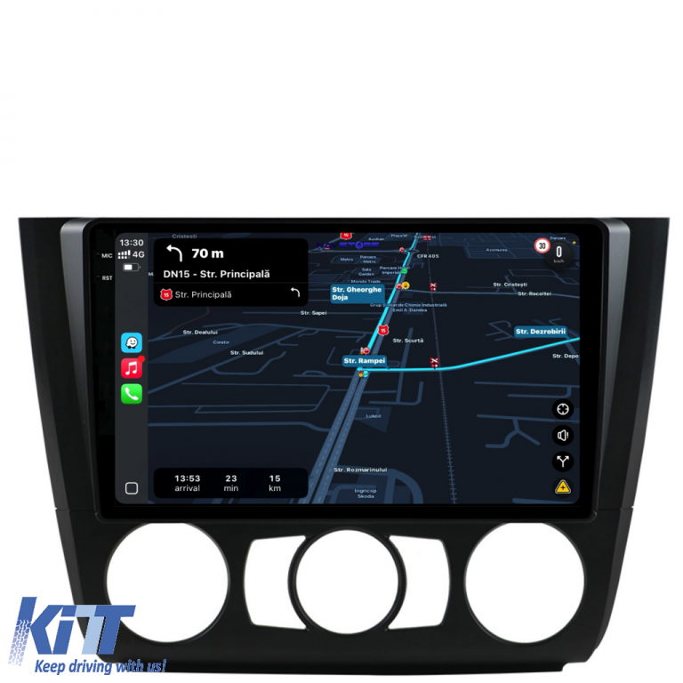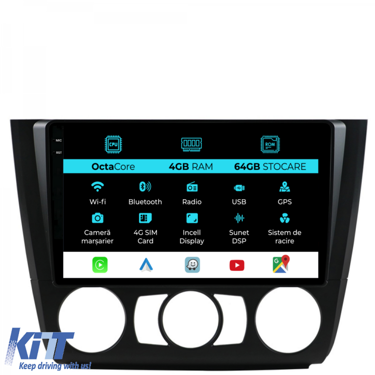 Operating System: Android 13 Processor: Octa-core RAM: 4GB Internal Storage (ROM): 64GB Display Size: 9 Inch Screen Resolution: 1360x800p Bluetooth: Bluetooth for calls, phonebook download and music playback WiFi: Yes (Integrated) 4G SIM Slot: Yes Network Connectivity: 4G, phone hotspot, external router, 3G or 4G dongle, CarPlay Android Auto Microphone: Built-in microphone, with the possibility to connect an external microphone Power Supply: 12V Audio Power: 4x45W DSP Equalizer: Digital Sound Processor (DSP EQ) USB SD Compatibility: Suitable for USB up to 128GB, SD support via USB adapter Android Apps Compatibility: Suitable for most Android apps from Google Play CarPlay and Android Auto Compatibility: Yes, suitable for iOS (CarPlay) and Android (Android Auto) Language Support: Romanian, English, Hungarian, Spanish, Italian, German, etc. Screen Type: Capacitive TouchScreen, multi-touch, IPS Brightness Settings: Yes RDS Radio: Yes RCA Subwoofer Output: Yes RCA Video Output: Yes, with the help of a USB adapter RCA Audio Output: Yes GPS: Yes, (Google Maps, Waze, HereWeGo) Parking Sensors: Yes (Parking sensor pickup with display where applicable) Steering Wheel Control: Yes (Steering wheel commands pickup with canbus or analog where applicable) DVR Camera Compatibility: Yes Reverse Camera Compatibility: Yes User Manual: Yes Package Contents: Android Navigation Adapter Frame Power Wiring GPS Antenna 4G Antenna RCA Connectors Wiring for reverse camera, 2 USB cables Canbus (only if applicable) Warranty Certificate Invoice Navigation is suitable for the following car brands: BMW: Series 1 E82 E88 E81 E87 (2004-2011).