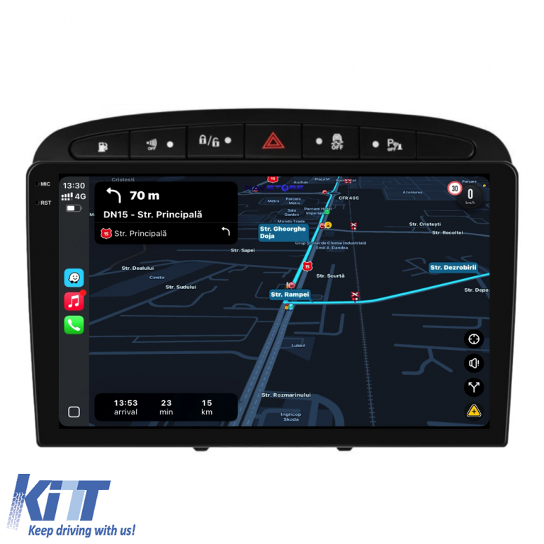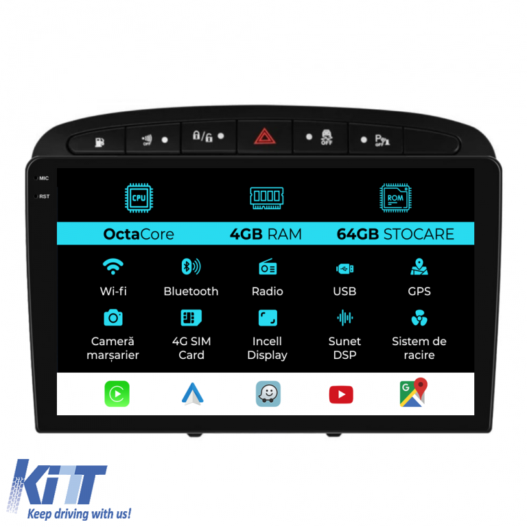 Operating System: Android 13 Processor: Octa-core RAM: 4GB Internal Storage (ROM): 64GB Display Size: 9 Inch Screen Resolution: 1360x800p Bluetooth: Bluetooth for calls, phonebook download and music playback WiFi: Yes (Integrated) 4G SIM Slot: Yes Network Connectivity: 4G, phone hotspot, external router, 3G or 4G dongle, CarPlay Android Auto Microphone: Built-in microphone, with option to connect external microphone Power Supply: 12V Audio Power: 4x45W DSP Equalizer: Digital Sound Processor (DSP EQ) USB SD Compatibility: Suitable for USB up to 128GB, SD support via USB adapter Android App Compatibility: Suitable for most Android applications from Google Play CarPlay and Android Auto Compatibility: Yes, suitable for iOS (CarPlay) and Android (Android Auto) Language Support: Romanian, English, Hungarian, Spanish, Italian, German, etc. Screen Type: Capacitive TouchScreen, multi-touch, IPS Brightness Settings: Yes RDS Radio: Yes RCA Subwoofer Output: Yes RCA Video Output: Yes, with help of a USB adapter RCA Audio Output: Yes GPS: Yes, (Google Maps, Waze, HereWeGo) Parking Sensors: Yes (Pickup parking sensors with display where applicable) Steering Control: Yes (Pickup steering commands with canbus or analog where applicable) DVR Camera Compatibility: Yes Reversing Camera Compatibility: Yes User Manual: Yes Package Contents: Android Navigation Adapter Frame Power Wiring GPS Antenna 4G Antenna RCA Connectors Wiring for reversing camera, 2 USB cables Canbus (only if applicable) Warranty Certificate Fiscal Invoice Navigation is suitable for the following car brands: Peugeot: 308 (2008-2013), 408 (2008-2013)