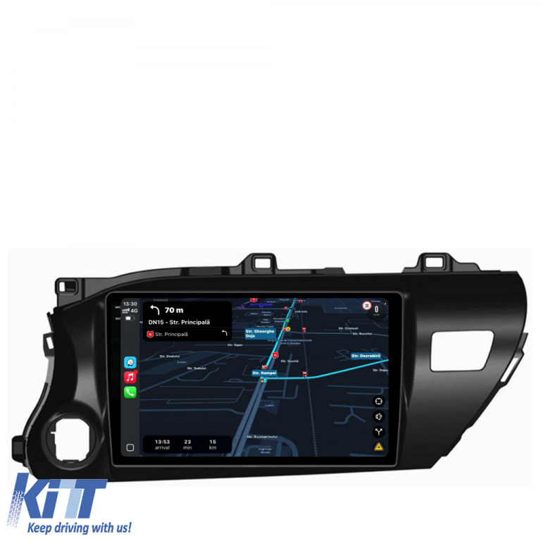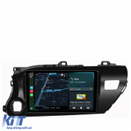 Operating System: Android 13 Processor: Quad-core 1.5Ghz RAM: 4GB Internal Storage (ROM): 64GB Display Size: 10 Inch Screen Resolution: 1280x800p Bluetooth: Bluetooth for calls, phonebook download, and music playback WiFi: Yes (Integrated) 4G Sim Slot: No Network Connectivity: Phone hotspot, external router, 3G or 4G dongle, CarPlay Android Auto Microphone: Built-in microphone, with the possibility to connect an external microphone Power Supply: 12V Audio Power: 4x45W DSP Equalizer: Digital sound processor (DSP EQ) USB SD Compatibility: Suitable for USB up to 128GB, SD support via USB adapter Android Applications Compatibility: Suitable for most Android applications from Google Play CarPlay and Android Auto Compatibility: Yes, suitable for iOS (CarPlay) and Android (Android Auto) Language Support: Romanian, English, Hungarian, Spanish, Italian, German, etc. Screen Type: Capacitive TouchScreen, multi-touch, IPS Brightness Settings: Yes RDS Radio: Yes RCA Subwoofer Output: Yes RCA Video Output: Yes, with the help of a USB adapter RCA Audio Output: Yes GPS: Yes, (Google Maps, Waze, HereWeGo) Parking Sensors: Yes (Integration of parking sensors with display where applicable) Steering Wheel Control: Yes (Integration of steering wheel controls with canbus or analog where applicable) DVR Camera Compatibility: Yes Reverse Camera Compatibility: Yes User Manual: Yes Package Contents: Android Navigation Adapter Frame Power Supply Wiring GPS Antenna RCA Connectors Wiring for reverse camera, 2 USB cables Canbus (only if applicable) Warranty Certificate Fiscal Invoice Navigation is suitable for the following car brands: Toyota: Hilux 2015+.