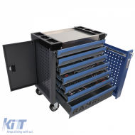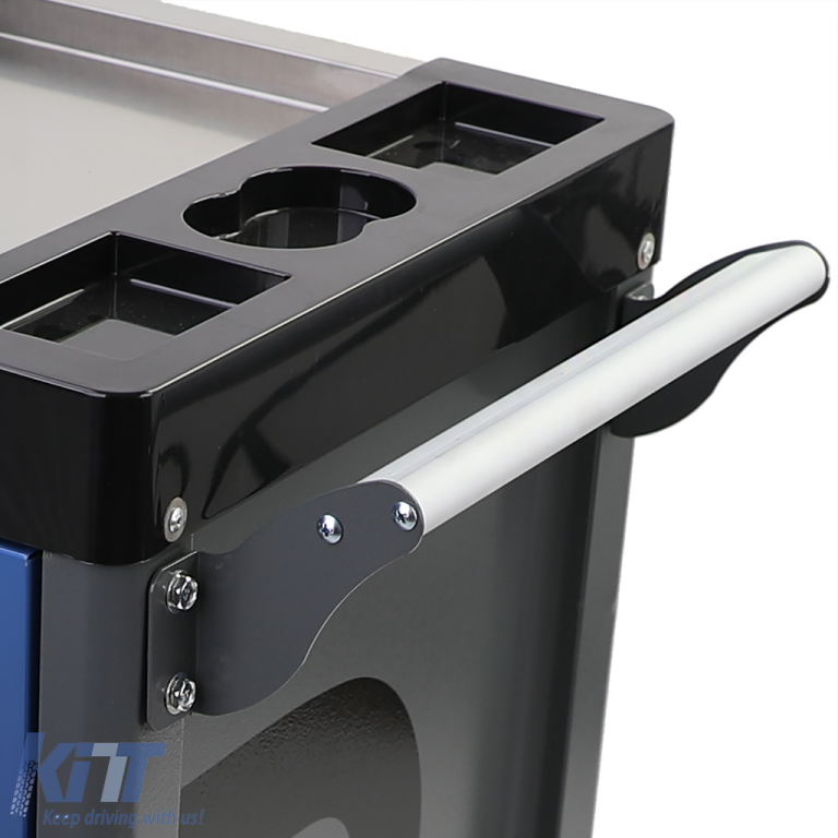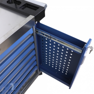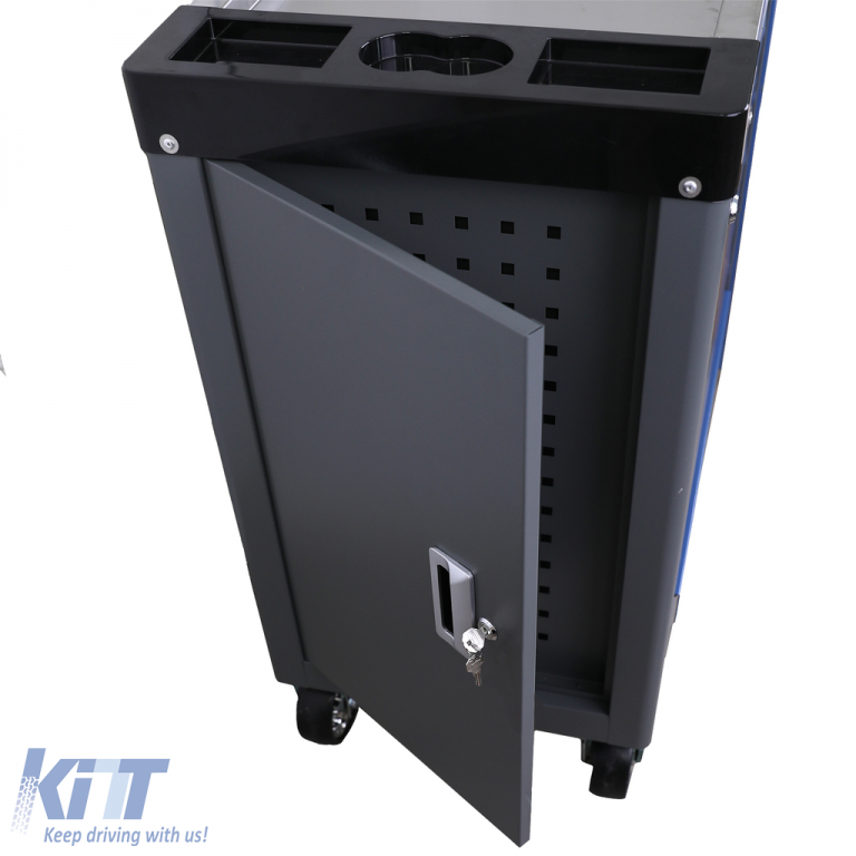 With ball-bearing drawers, a side lockable compartment with perforated sheet metal, and a vertical pull-out with perforated sheet metal, this tool trolley offers secure storage options. The can holder and the central stainless steel tray on top complement the practical details, while the aluminum handle makes it easier to push the trolley.